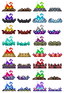 Actualmente existen 8 variantes de hogueras creables, ocasionalmente pueden ser encontradas en el subsuelo junto a algunas monedas.