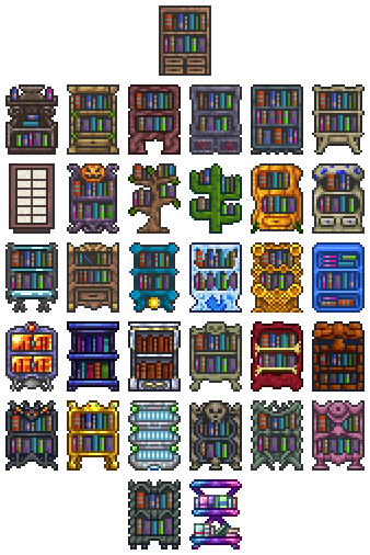 En total existen 33 librerías. 27 se pueden crear y 6 se consiguen en distintas partes de mundo: 1 en el inframundo, 4 en la mazmorra y la última es dejada por los piratas. Todas las librerías sirven para lo mismo y ocupan el mismo espacio, la diferencia solo es visual.