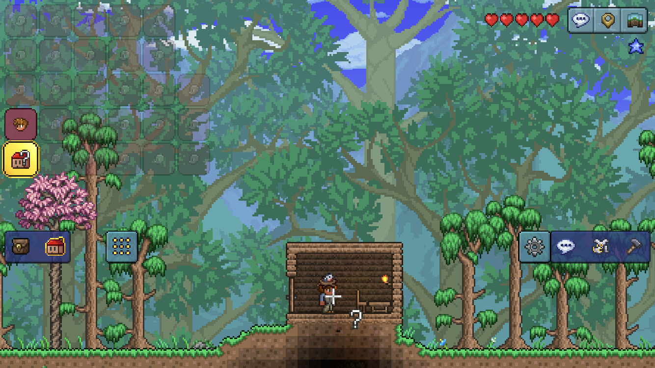 The touch screen features the players hotbar, housing menu, map, and other utilities. This is referred to by the game as the "Quick Inventory". The quick inventory shows the first ten slots in the players inventory, similarly to the mobile version of the game. The top left button under the hotbar allows the player to Quick Stack to Nearby Chests, which will be greyed out if the player is not near any chest. The middle button allows the player to drop an item they've tapped and held onto, greyed out if there is no item to drop. The top right button is the housing menu, which will be greyed out unless the player is in a house.