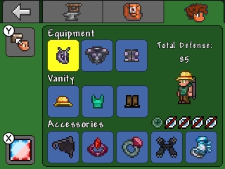 The player's armor and accessories are on the last tab of the inventory. Pressing