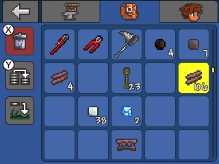 | Inventory | Tap the inventory icon on the touch screen or ZR on the New Nintendo 3DS | Opens the player's inventory, and by extension, their crafting and gear menus. The game will automatically pause, unless you are on a multiplayer server. |