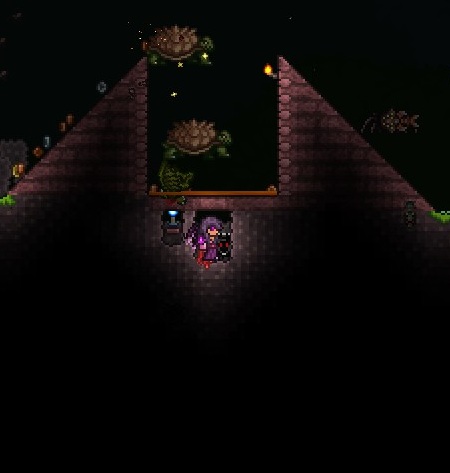 The simplest way to keep most enemies contained is with a pit filled with Lava. It can deal effectively with most basic grounded enemies, as well as some flying ones, however it is ineffective against Casters and those that can phase through blocks. A common design is the "Volcano farm": a Lava Pit between two ramps, made with hammered Blocks. When the player is standing below the pit, enemies that spawn will climb up the slopes and fall into the lava pit. The pit should be at least 8 blocks deep so grounded enemies cannot jump out. Note that flying enemies will usually avoid the Lava (if the player is underneath the lava pit, that can lead some flyers to their death), but they can still be killed by other methods, such as Minions or Traps. Many enemies also lack the ability to drop down from Platforms, which can be exploited to effectively trap them in a certain part of the farm.