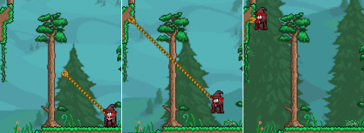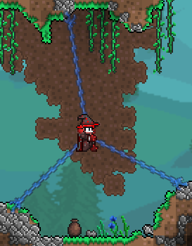 Several higher-tier hooks, like the Ivy Whip, allow the player to grapple multiple surfaces simultaneously. If the character grapples one surface, then fires the hook a second time, another chain extends from the player without dislodging the first. Upon grappling a second surface, the player will be suspended in midair at a point midway between the two surfaces. This allows players more freedom during construction, or for navigating hazardous areas, such as above lava or Meteorite.