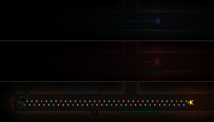 The glow provided by certain Hooks: Dual Hook blue end (top), Dual Hook red end (middle), and Christmas Hook (bottom). No light sources other than the Hooks are present in this shot.