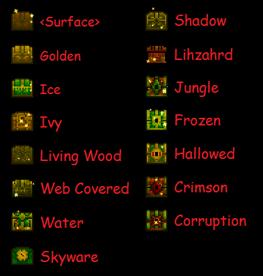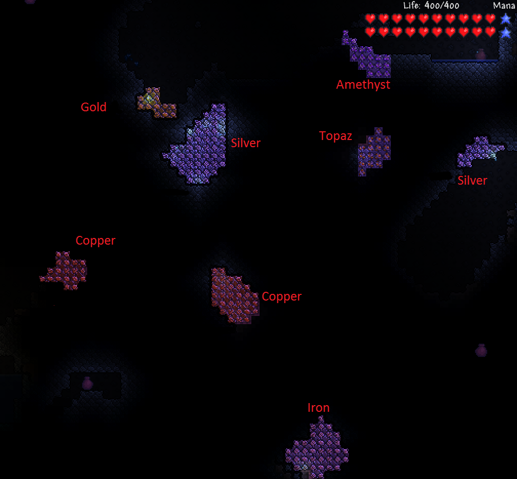 - ↑ Tin, Lead, Tungsten, Platinum, Meteorite, Crimtane, Obsidian, Hellstone, Palladium, Orichalcum, Titanium, Chlorophyte, and Diamond are not included.