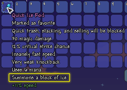 在很多物品上还会显示附加的文本,这就是在本 wiki 上称为物品的“工具提示”的东西(它们在泰拉瑞亚的游戏代码中也是这样称呼的)。它们通常更进一步地描述了此物品,而且经常是以有趣或幽默的方式。