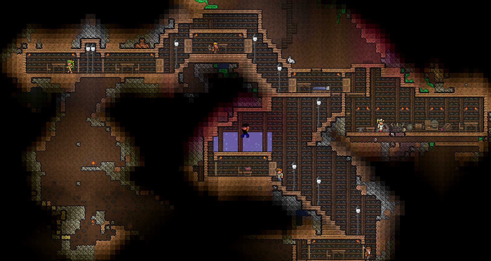 泰拉瑞亚也可以在多人模式中玩,在其中可以有不止一个玩家在同一个世界中玩。多人模式游戏可以是合作游戏,玩家可以共同建造东西或克服挑战,就像单人游戏中一样,或者可以是竞争性的 PvP 游戏,玩家或队伍可以相互对抗。